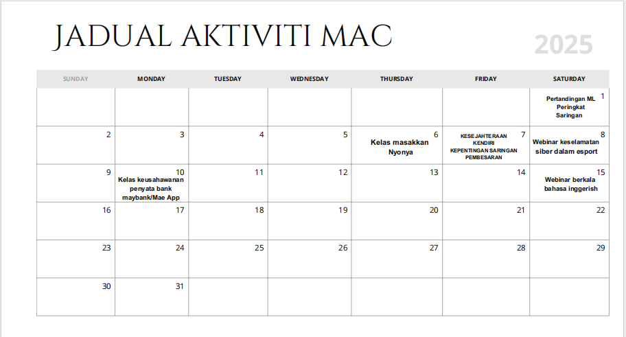 Jadual Aktiviti Mac 2025
